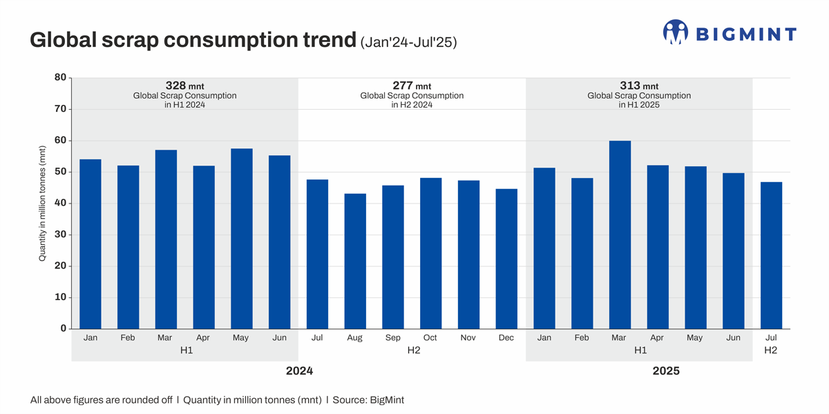 Scrap consumption is expected to continue its downtrend in Q3CY’25. BigMint data shows consumption stood at 360 mnt in 7MCY’25, a 4% drop from 376 mnt in 7MCY’24.