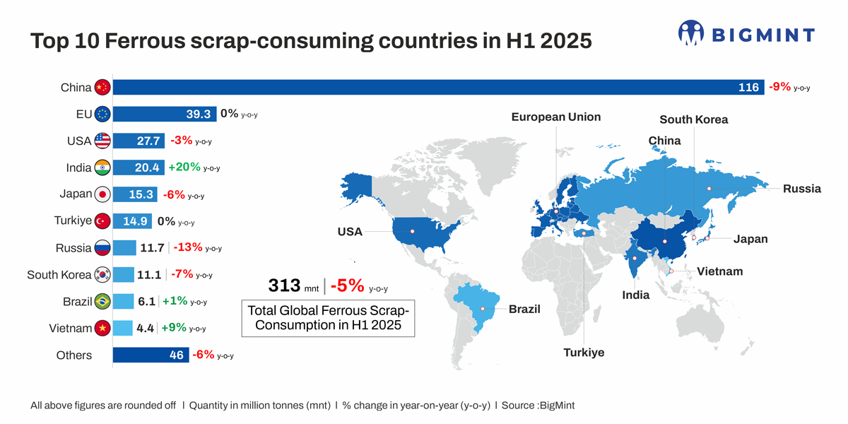 Morning Brief: Global ferrous scrap trade volumes, excluding European intra-trade, increased by around 2% y-o-y to around 29.38 million tonnes (mnt) in January-June 2025, reveals data maintained with BigMint. This marks a slow but steady improvement from almost 28.88 mnt in H1CY’24, despite a global economic slowdown.