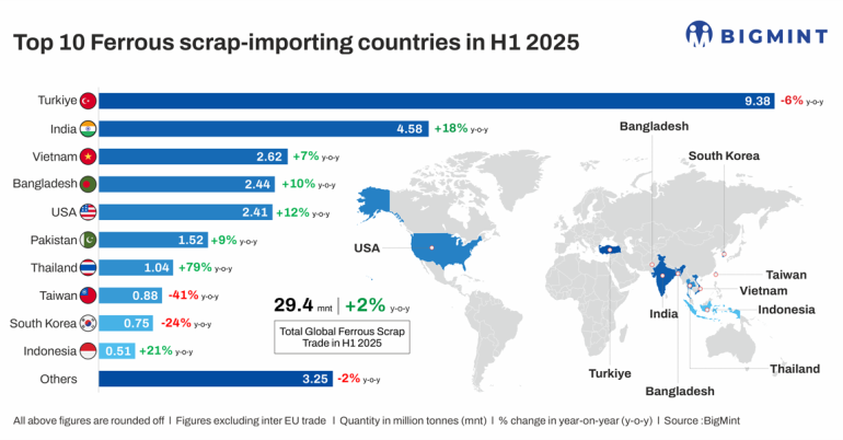Morning Brief: Global ferrous scrap trade volumes, excluding European intra-trade, increased by around 2% y-o-y to around 29.38 million tonnes (mnt) in January-June 2025, reveals data maintained with BigMint. This marks a slow but steady improvement from almost 28.88 mnt in H1CY’24, despite a global economic slowdown.