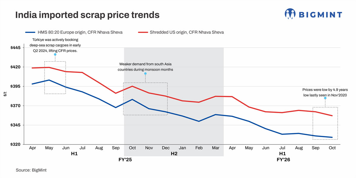 Imported scrap prices in South Asia softened y-o-y in H1FY’26 in line with the downtrend in finished steel tags. However, lower prices also led to a favourable buying environment, which supported the increase in imports. Shredded averaged around $367/t in H1FY’26 in India, down from approximately $409/t in H1FY’25, while HMS 80:20 averaged $341/t versus $388/t in H1FY’25.