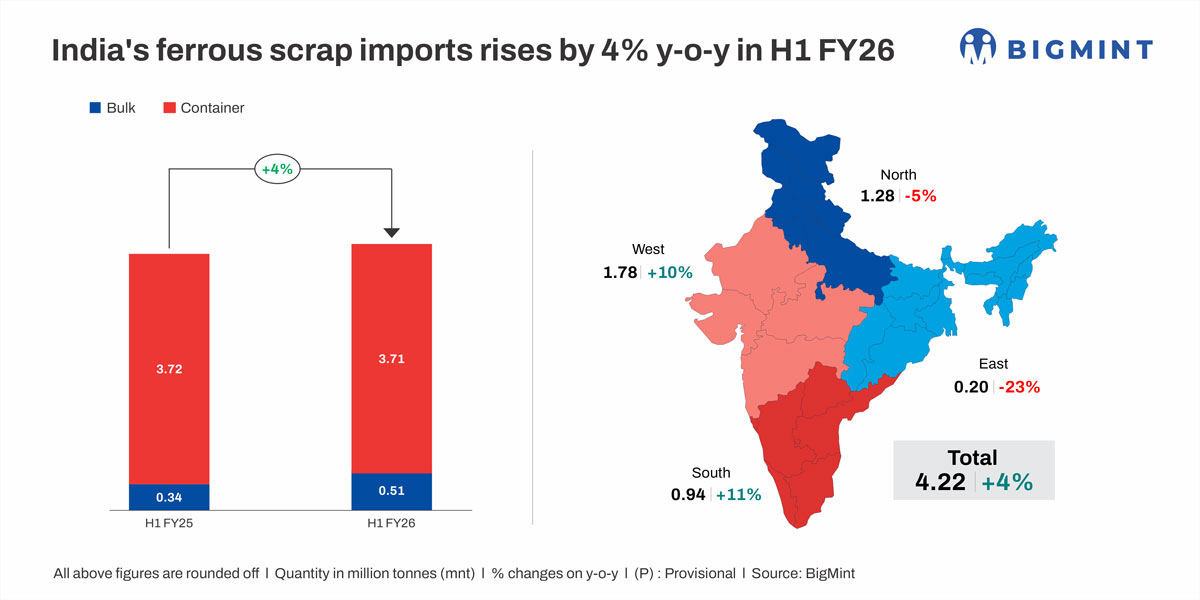 Morning Brief: India’s ferrous scrap imports rose slightly by 4% to 4.22 million tonnes (mnt) in H1FY’26 from 4.06 mnt in H1FY’25, as per data maintained with BigMint.