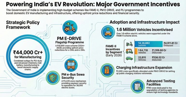 Through major programmes — including FAME-II, PLI Auto, PLI ACC, PM E-DRIVE, and SPMEPCI — the Government is providing subsidies and incentives to accelerate EV adoption, expand manufacturing capacity, and build a nationwide charging infrastructure network. Together, these measures form a comprehensive framework to advance electric mobility across India.
